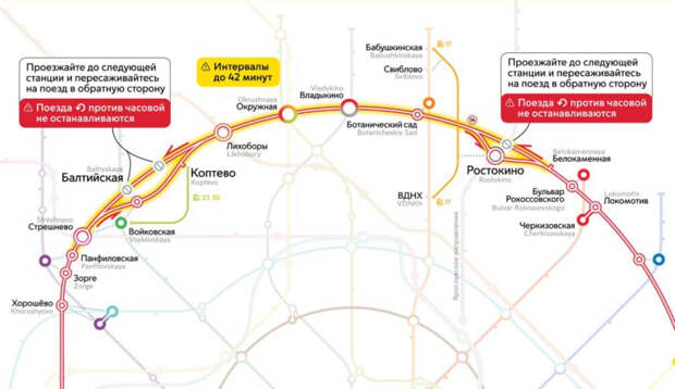 18 октября не будут останавливаться на станции Ростокино поезда, идущие против часовой стрелки. Поэтому для проезда в сторону Ботанического сада и далее нужно будет сначала проехать в обратном направлении от Ростокино до Белокаменной и там пересесть на поезд в нужную сторону. При этом стоит учесть, что часть поездов против часовой стрелки не будет проезжать далее Белокаменной.