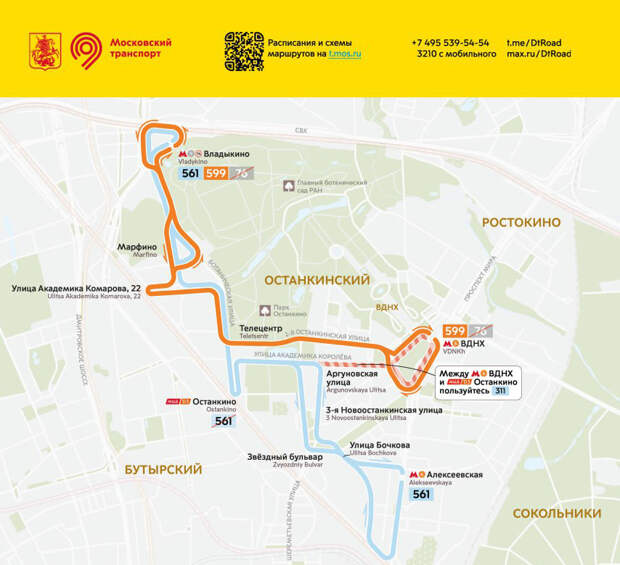 Также добавят машин на маршруте 599, который курсирует между ВДНХ и «Владыкино» – они компенсируют отмену 76-го.Правда, в результате слияния маршрутов «выпадет» участок на улице Академика Королёва между Останкинским проездом и ул. Аргуновской (остановки «Улица Цандера» и «Аргуновская улица»). Кроме того, на объединенном маршруте 561 не удастся доехать от ВДНХ до станции МЦД Останкино. Впрочем, на эти случаи есть 311-й автобус, который ходит через ВДНХ по Академика Королёва и доезжает как раз до МЦД.