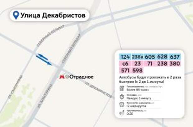 Этот участок у метро «Отрадное» довольно загружен, здесь ездят автобусы 12 маршрутов. Специалисты прогнозируют, что благодаря нововведению они смогут преодолевать его вдвое быстрее.Выделенка на Берёзовой аллее заработает на пересечении с МСД и проездом Серебрякова. Здесь пролегают маршруты пяти автобусов, которые нередко тратят на небольшом 150-метровом участке до пяти минут. Ожидается, что после ввода выделенки это время сократится в несколько раз.