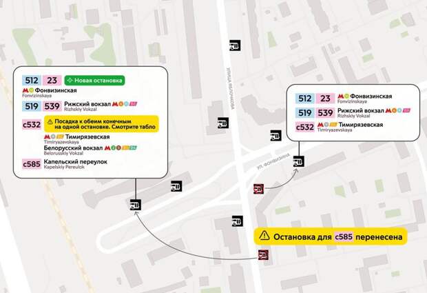 Все они сейчас не доходят до «Тимирязевской». Первые два сворачивают с ул. Фонвизина на Яблочкова, а третий так и едет по Яблочкова, как ехал. Но с 11 октября они начнут доезжать по улице Фонвизина до метро и останавливаться на той же остановке, что и маршруты 519, 539 и с532. Кстати, попутно посадку для с532 в обе стороны сделают в одном месте – будьте внимательны.Кроме того, для автобусов 23, 512, 519, с532, 539, следующих от метро «Тимирязевская», изменят остановку на пересечении улиц Фонвизина и Яблочкова. Её перенесут чуть дальше от перекрёстка с Яблочкова, к дому на Фонвизина, 4.