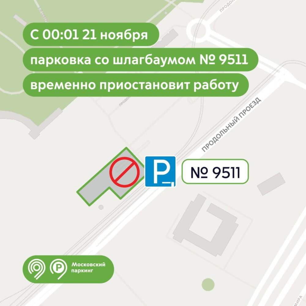 В районе ВДНХ временно прекратила работу парковка со шлагбаумом №9511. Об этом предупредил Департамент транспорта Москвы и «Московский паркинг». Закрытая парковка находится на нечётной стороне Продольного проезда, между его пересечением с 1-м Северным проездом и 2-м Поперечным проездом. Стоит