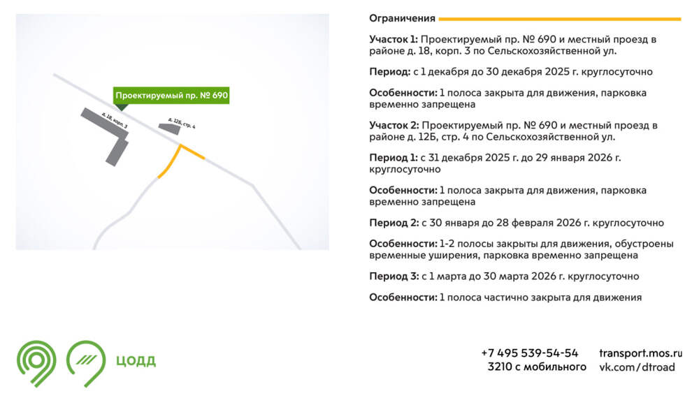 С начала декабря до 30 марта 2026 года на участках Проектируемого проезда № 690 будут недоступны для движения одна-две полосы. Это связано с проведением инженерных работ, передают Департамент транспорта Москвы и ЦОДД. Проектируемый проезд №690, который является продолжением набережной Говорухина,